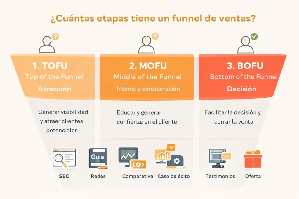 En marketing digital, estas etapas suelen agruparse en tres grandes niveles conocidos como TOFU, MOFU y BOFU, que representan la parte superior, media e inferior del embudo.